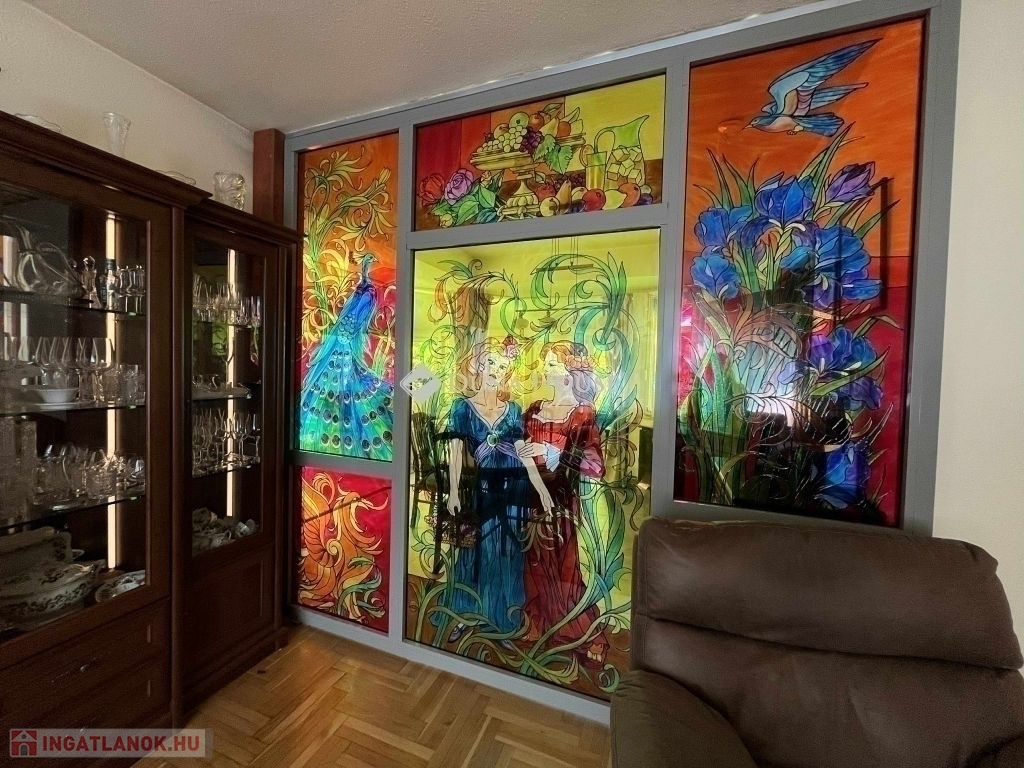 - neves üvegművész tervei alapján készült különleges üveg tolóajtó a nappali és étkező elválasztására