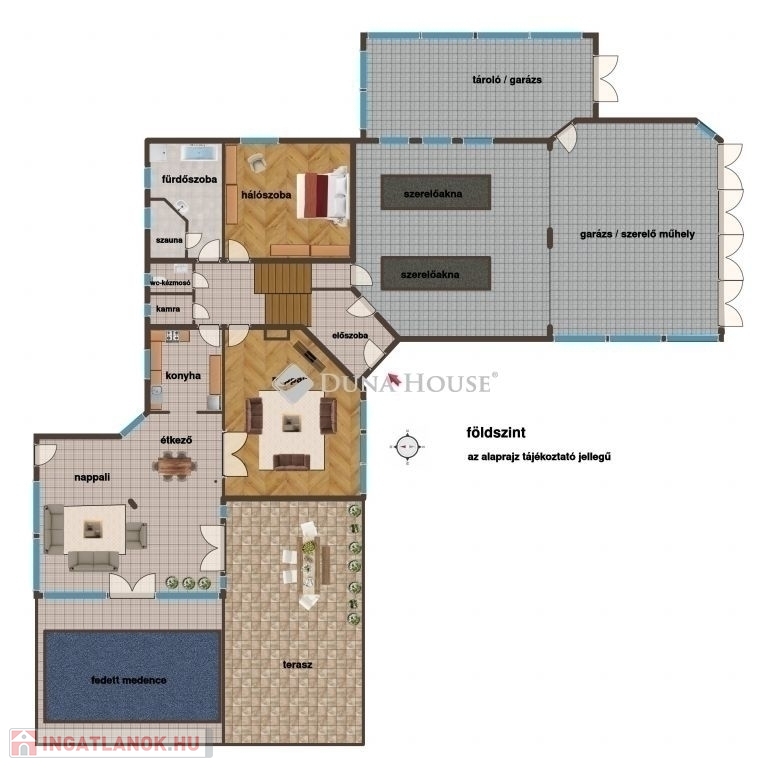 - 30 m2 beépített terasz közvetlen átjárással a nappaliba, a teraszon fedett 6 x 3 x 1,5 m mély medence
