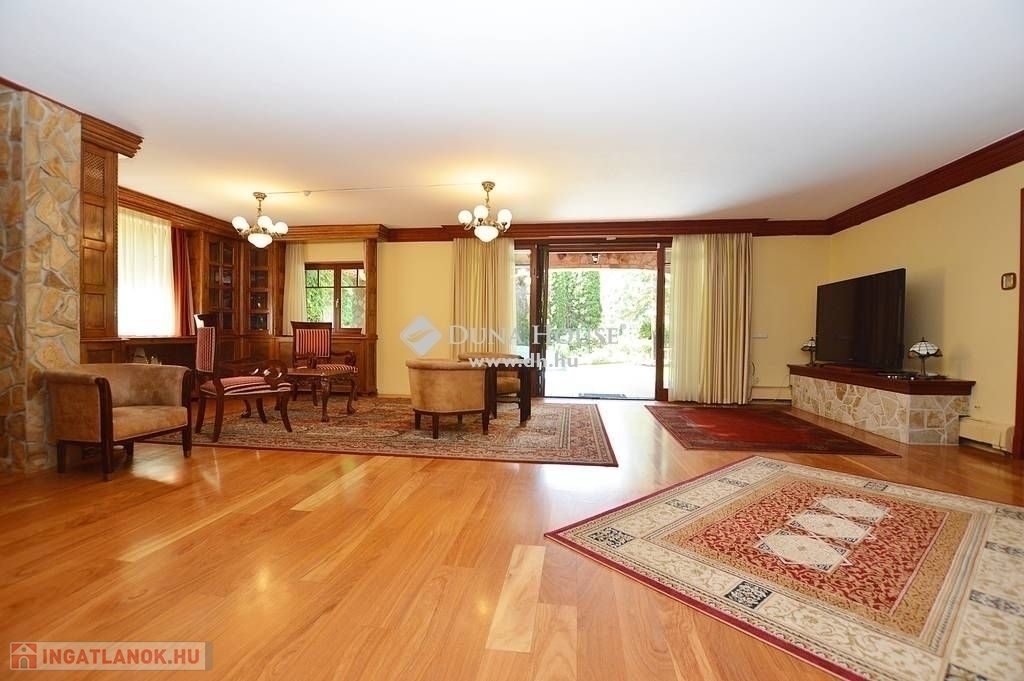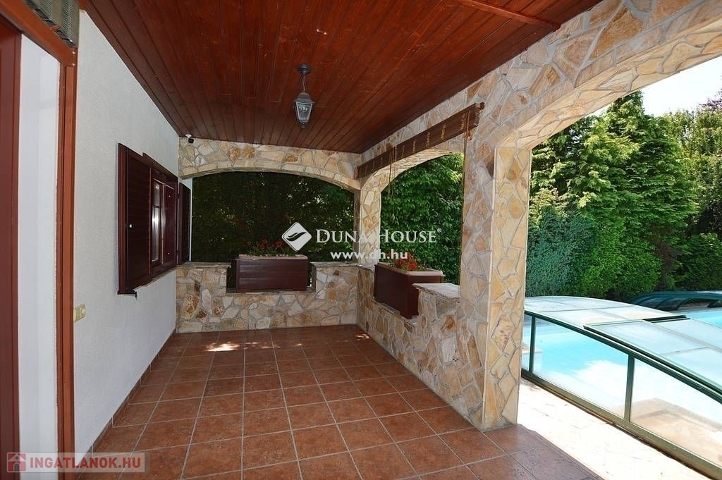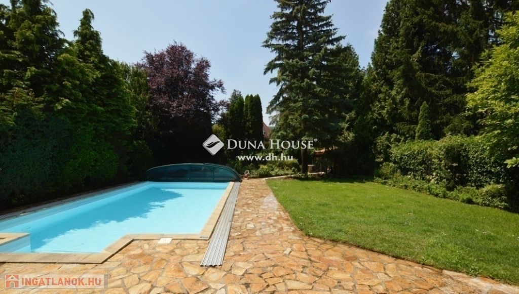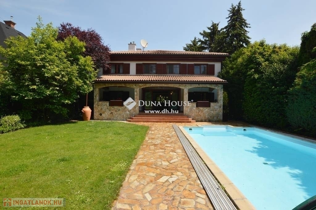 Budaligeten eladó egy nappali + 5 szobás, mediterrán stílusú, medencés családi ház.