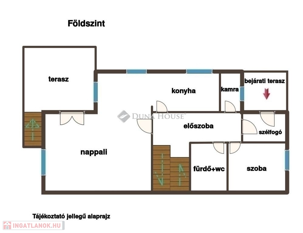 A földszinten a nagy méretű nappali és szintén tágas konyha, egy hálószoba és egy fürdőszoba kapott helyet, illetve a nappaliból kilépve itt található a hangulatos, fedett terasz, melyről közvetlen lejárat van a lakópark kertjébe.
