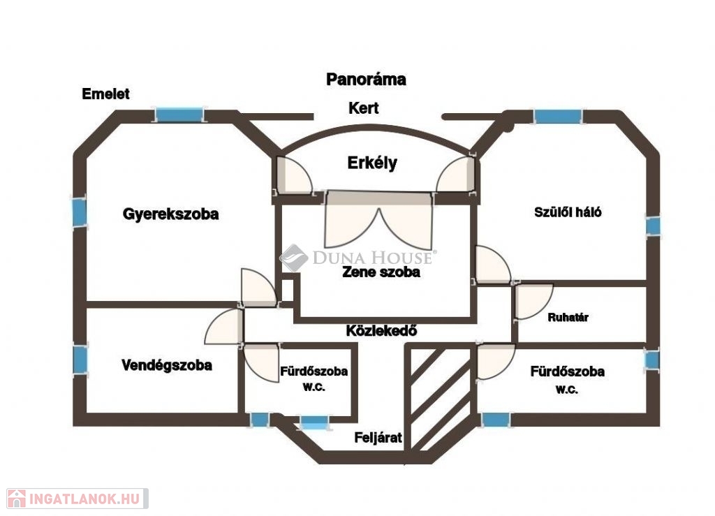 A felső szinten, a földszinti kialakításhoz hasonlóan a központi térben egy közösségi tér, zeneszoba, tőle balra a gyerekszoba és jobbra a szülői hálószoba. Mindhárom szobából kijárat a kb. 12 nm-es DNY-i tájolású, 180 fokos panorámával rendelkező erkélyre. A szülői hálóhoz kapcsolódik egy gardróbszoba és egy kádas fürdőszoba. A szinten található még egy további vendégszoba, saját tusolós fürdőszoba W.C.-vel.
