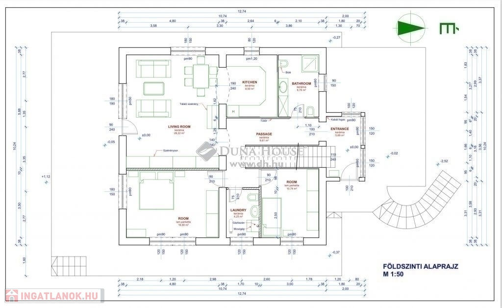 A 116 m2-es földszinten előszoba, 2 fürdő-wc, 2 hálószoba és a hatalmas nappali-konyha terasz kapcsolattal található. A nappalival kapcsolatos terasz közel 50 m2-es.