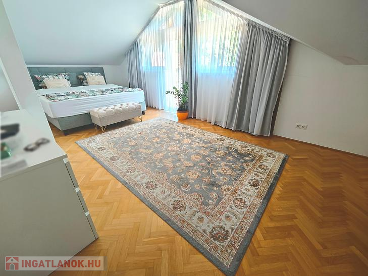 • Emelet: 3 szoba, 1 konyha, 1 gardrób, 2 fürdőszoba, 1 külön wc található. A nagy szobából nyílik egy 9,96nm-es erkély, amely hátsó kertre néz és gyönyörű kilátást biztosít az Apáthy-sziklára