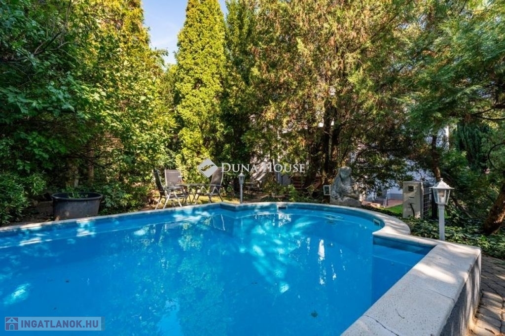 A gondozott kertben egy hangulatos medence és egy romantikus szaletli is helyet kapott, ahol a nyári délutánok csendje, a lombkoronák árnyéka és a madárcsicsergés teszi teljessé a pihenés pillanatait. Ez a kert nem csupán zöld környezet, hanem a nyugalom és az elvonulás intim színtere, a villa természetes meghosszabbítása.