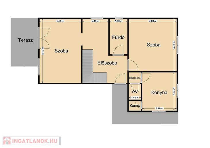A ház alsó szintjén található az előszoba, konyha, étkező, egy fürdő és a nappali, ahonnan a terasz nyílik. Az emeleten 3 szoba, egy fürdő és egy erkély található.