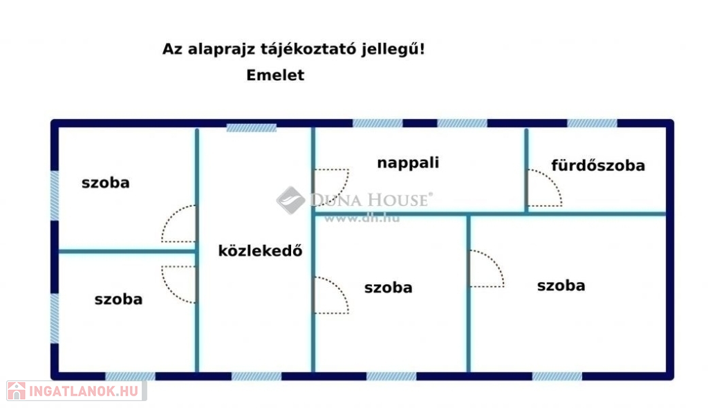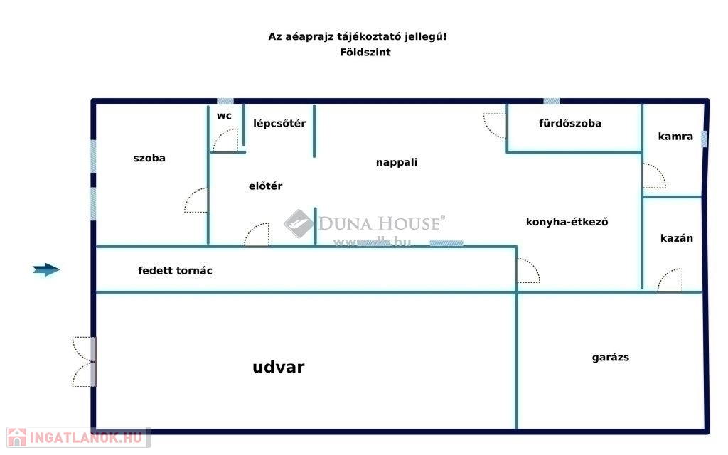 földszint: nappali, ebédlő-konyha, kamra, szoba, garázs, előszoba, fürdőszoba, háztartási helyiség, fedett tornác