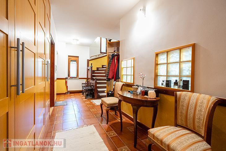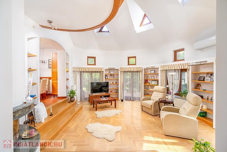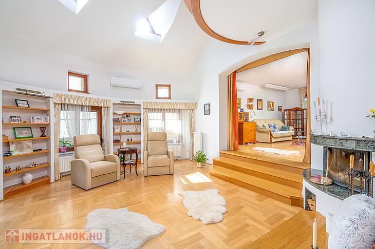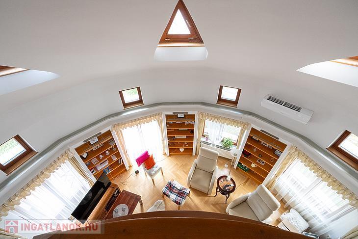 A 1998-ban épült, masszív, 38 cm-es Porotherm téglából készült épületet az eredeti építtető és tervező gondos odafigyeléssel tájolta, a belső tereket pedig funkcionálisan és esztétikusan alakította ki. A ház egyik különleges eleme a szinteltolásos, körcikk alakú nappali, amely galériás kialakításával, kandallójával és nagy belmagasságával lenyűgöző központi teret biztosít – ez a ház valódi szíve.