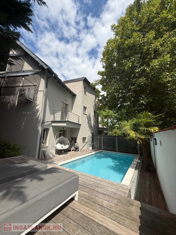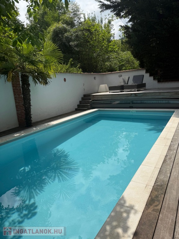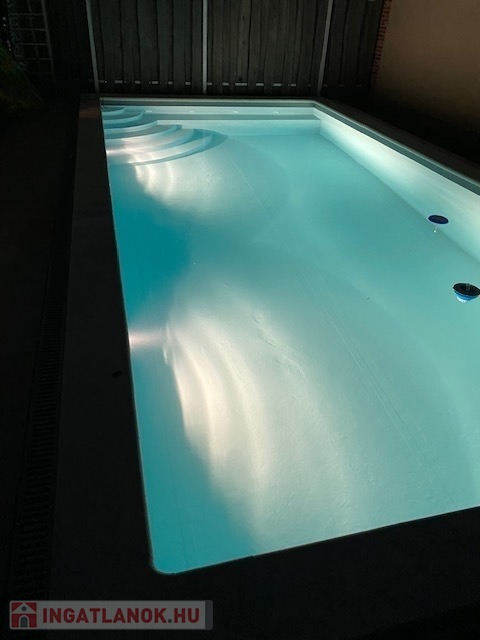 A hátsó teraszról nyíló kertben 8 × 4 méteres, gazdaságosan fűthető, nyakzuhanyos medence várja új tulajdonosát – tavasztól késő őszig használható, a köré épített faburkolatú napozóterasszal együtt valódi nyaralóélményt ad.