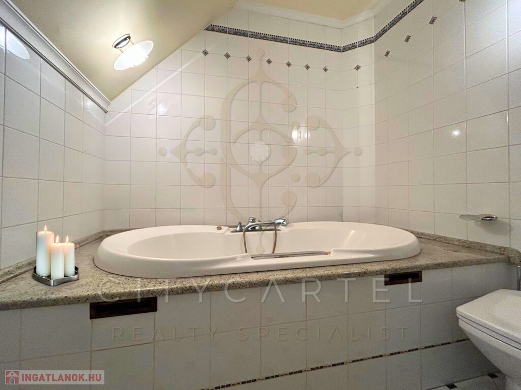 Emelet: három nagy hálószoba (25,76 nm-es, 19,68 nm-es, 16,9 nm-es) a legnagyobbhoz privát, panorámás 27,8 nm-es terasz, nagy 7,67 nm-es kádas fürdőszoba, 4,45 nm-es gardrób és egy nagy 18 nm-es előtér-közlekedő.