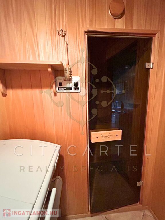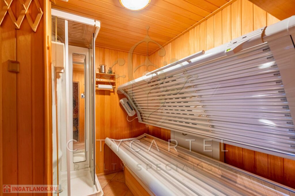 Alsó szint: klubhelyiség kandallóval, wellness-részleg (finn szauna, szolárium, zuhanyzó), kondihelyiség/télikert, társalgó/vendégszoba, tárolók, mosókonyha, gépészeti helyiség, 48 nm-es kétállásos garázs, 17 nm-es tárolóval, műhellyel – egybenyitásával további 1-2 személygépkocsinak garázshely megoldható