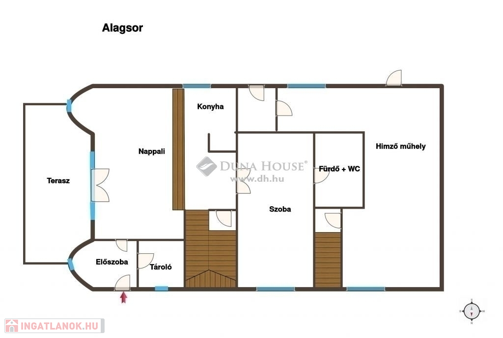 Az alagsorba belső lépcsőházon keresztül jutunk egy U alakú hímzőműhely (55.9 nm) félszuterén szintre. A ház oldalsó bejáratán keresztül egy teraszkapcsolatos lakásba lépünk. Az előszobából a világos, nagy méretű konyha-nappaliba - teraszkapcsolattal - jutunk, amelyből egy háló és egy zuhanyzós fürdőszoba nyílik.