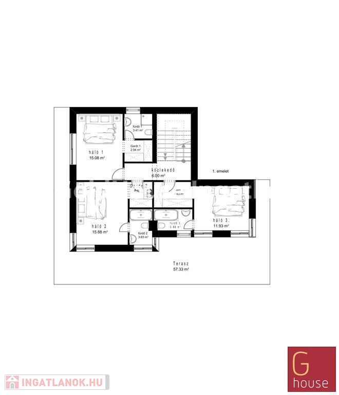 Az emeleten 3 különálló hálószoba kapott helyet, ideális választás nagyobb család számára is.
