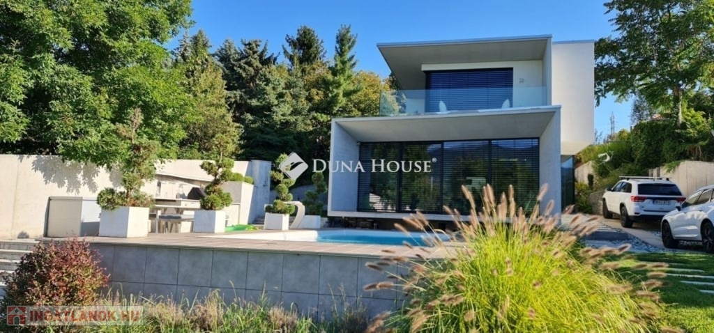 III. kerület, Aranyhegy csendes, zöld, mégis kiemelten keresett részén eladó egy minimál stílusú, modern, nappali + 4 hálós családi ház, nagyvonalú terekkel, medencével, óriási teraszokkal és igényesen parkosított, nagy méretű telekkel.