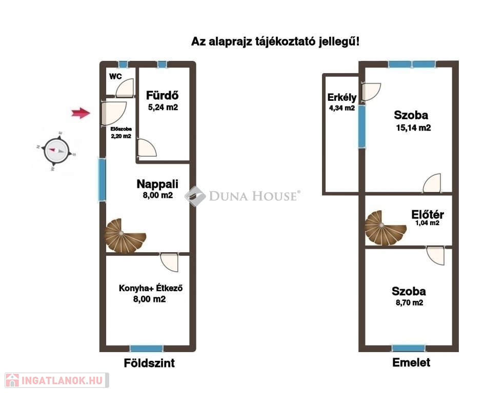 Földszint: Nappali, Konyha, Fürdő, WC, előszoba.