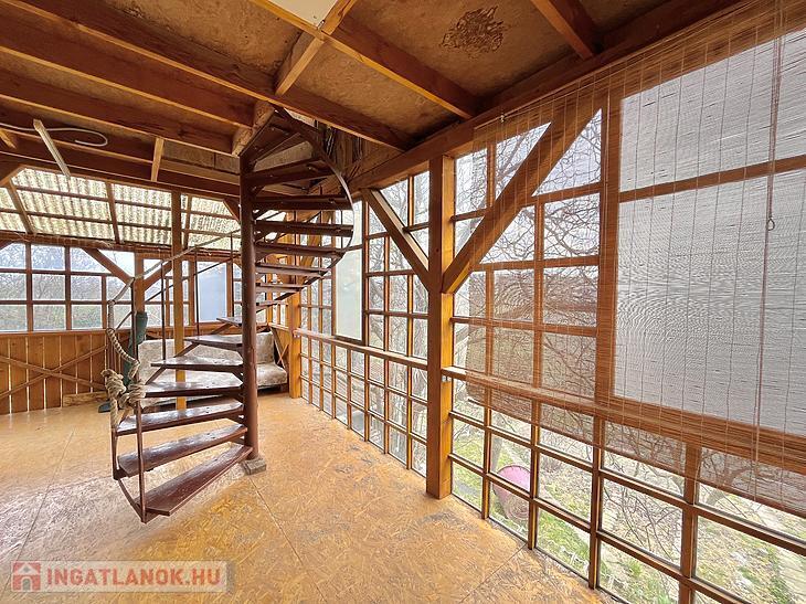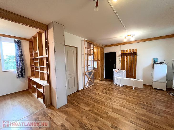 Jelenlegi elosztása a földszinten konyhából, kádas fürdőszobából és egy tágas térből áll, ahol egy térelválasztó könyvespolc és egy egyedi beépített tükrös gardróbszekrény található. A külön bejáratú emelet egy szobából és fürdőből áll, amely még befejezésre vár.