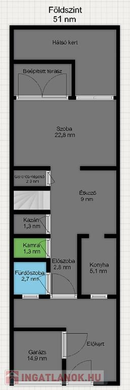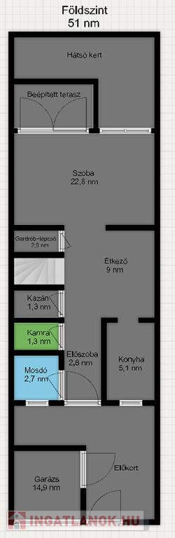 A földszinten kialakításra került egy nagy nappali, mely könnyedén két szobára osztható, konyha, étkező, kamra, gardrób, wc, egy kb 10 nm-es, beépített terasz és egy kb. 20 nm-es kert.