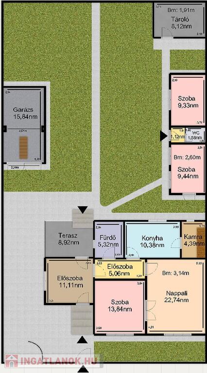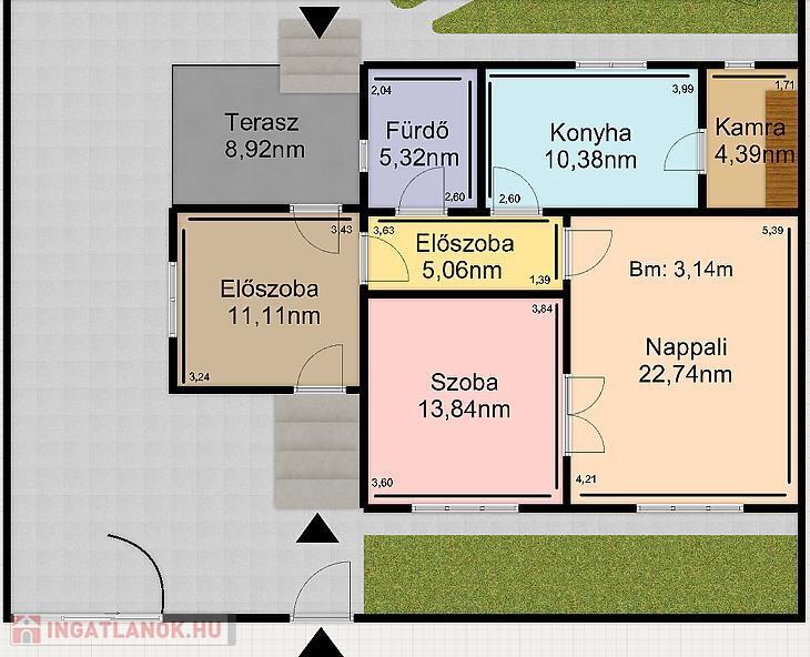 Nettó 77,3nm-es, 2szoba, előszoba, közlekedő, konyha, fürdőszoba + wc helyiségekből áll, illetve az előszobából nyílik egy 8,92nm-es TERASZ is. A ház alatt található egy kb. 10nm-es pince, ami a kamrából közelíthető meg, a padlásfeljáró is itt található. Tetőtere beépíthető, mivel beton födémes, a tető váza pedig vas szerkezetű, zsindely borítással.