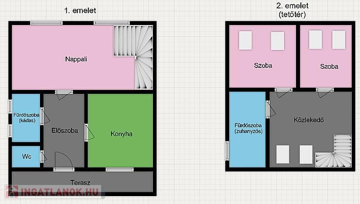 A teljes ingatlan egy különnyíló földszinti lakrészből és egy szintén különnyíló belső kétszintes emeleti lakrészből épül fel.