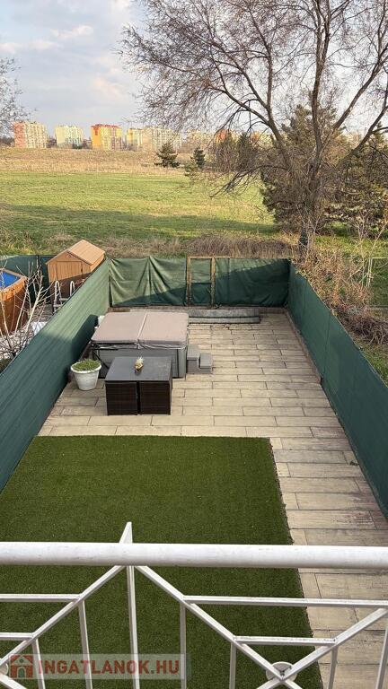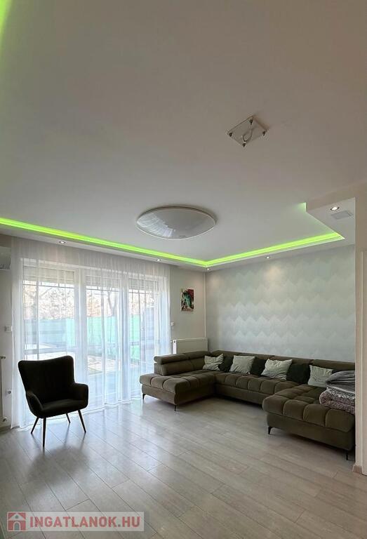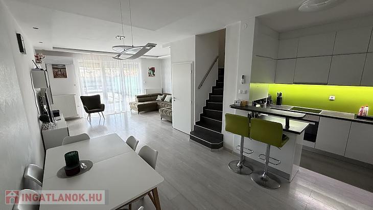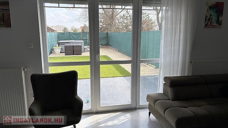 A 111 nm-es lakás (ebből 100 nm fűtött lakótér) egy 190 nm-es telken helyezkedik el, praktikus elrendezéssel. A nappali mellett három külön nyíló hálószoba biztosít kényelmes életteret, így ideális választás családok számára. A világos nappaliból közvetlen kijárat nyílik a hangulatos, műfüves hátsó kertbe, amely holland pázsittal burkolt, gondozásmentes zöld környezetet kínál. Az előkert és a hátsó kert is rendezett, privát teret biztosít a pihenéshez.