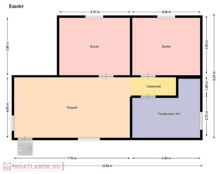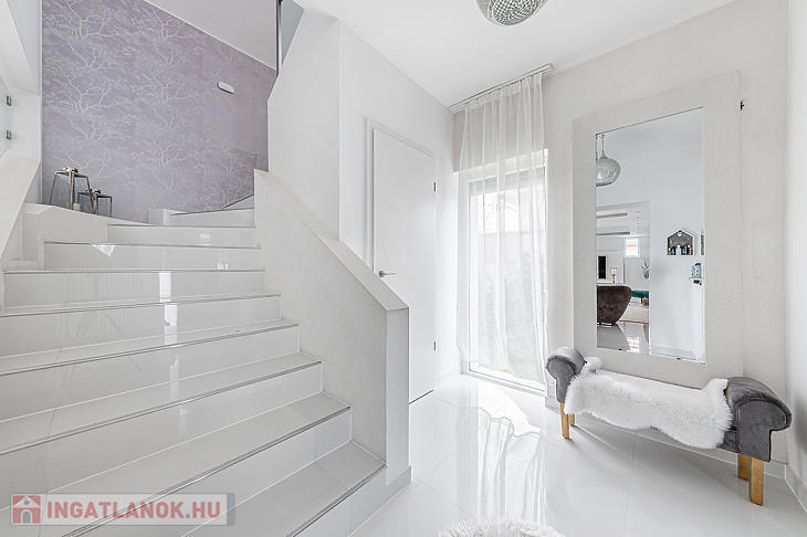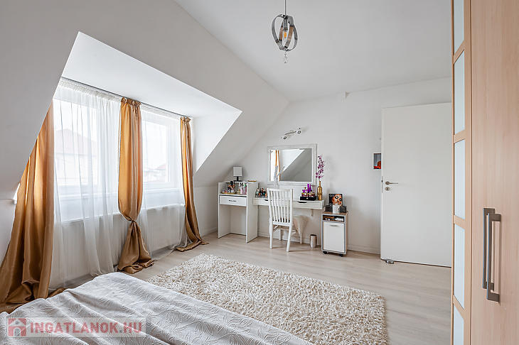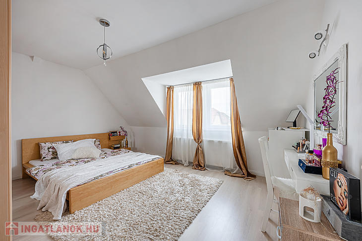 Az ingatlan elosztása kiváló, az alsó részen egy hatalmas nappali található, konyhával és étkezővel, a felső szinten pedig két szoba és egy tágas fürdőszoba lett kialakítva.