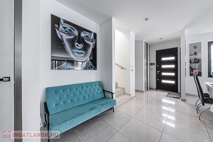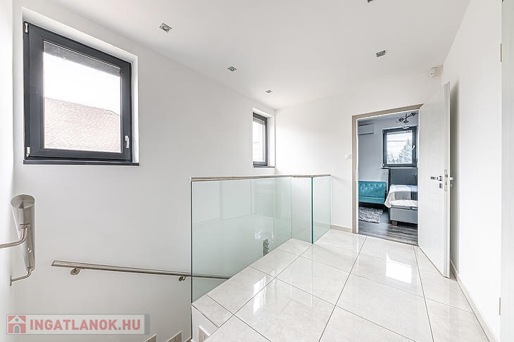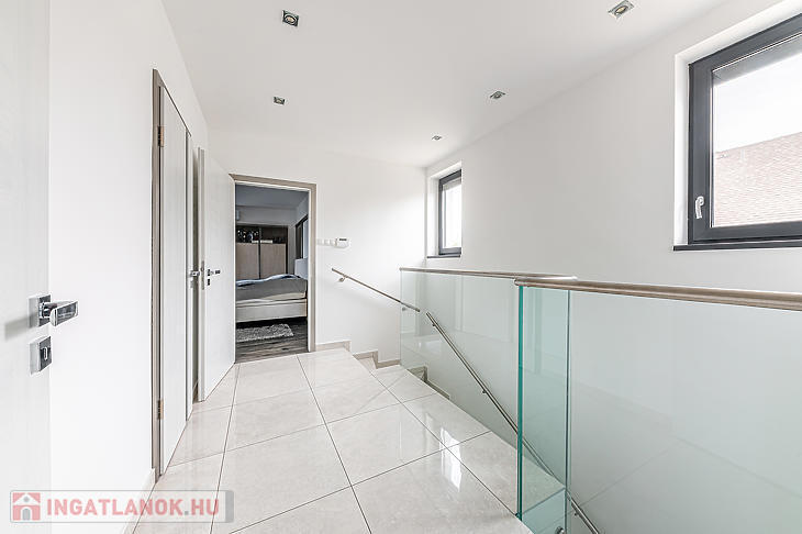 A földszinten, a bejárati ajtón belépve egy rendkívül tágas amerikai konyhás nappaliban találjuk magunkat – ez a ház központi része, ahonnan bármelyik helyiségbe kényelmesen eljutunk. Itt található a szülői háló, amelyhez privát fürdőszoba és gardróbhelyiség tartozik, továbbá egy dolgozószoba, mosókonyha, tárolóhelyiségek, vendégmosdó és közvetlen megközelíthetőség a garázshoz is. A földszinti helyiségek java részéből a kert közvetlenül elérhető. A felső szinten kettő hálószoba és egy fürdőszoba található. Az egyik szoba 15 négyzetméteres terasszal rendelkezik.