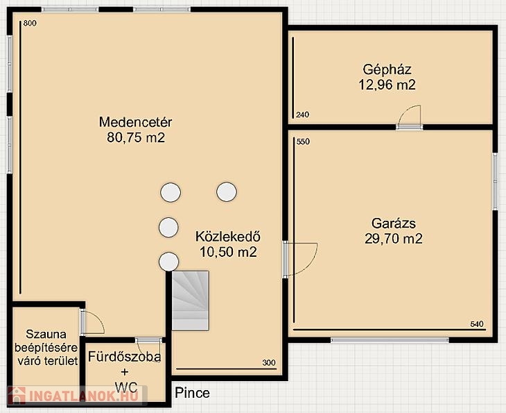 A pince szinten található egy beltéri, fűthető medence és egy dupla beállásos garázs. A garázs előtti autóbeálló kettő autó parkolására alkalmas. Illetve az utcán kialakításra került 4 db autóbálló hely.