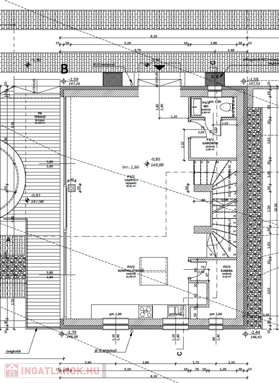 A földszinten található az amerikai konyhás nappali, gardrób, kamra, zuhanyzós fürdőszoba. A nappali közvetlen kapcsolatban van egy 22 m2 területű terasszal. Konyhája egyedi építésű konyhabútorral beépített, benne Bosh típusú konyhagépekkel, melyek az ár részét képezi.
