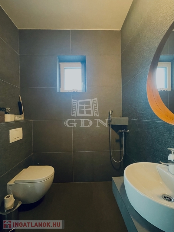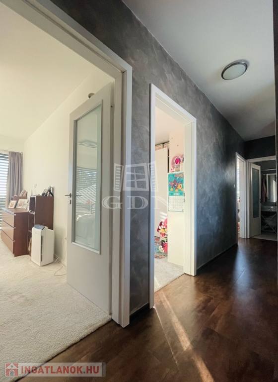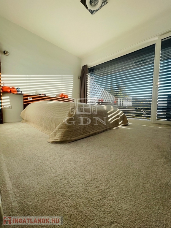 Az emelet hálószoba, gardróbszoba, gyermekszoba, dolgozó szoba és két fürdőszoba kiépítésű. A fürdőszobák kádas/zuhanyzós, illetve sarokkádas kialakításúak. A háló és gyermek szobából az épületen végig húzódó 16 m2 területű, panorámás teraszra léphetünk.