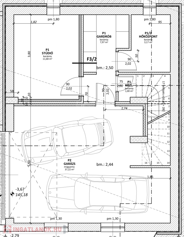 Az alsó szint kétállásos garázs, közlekedő, hangszigetelt dolgozó szoba, gépház tagozódású.