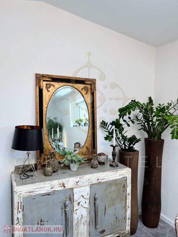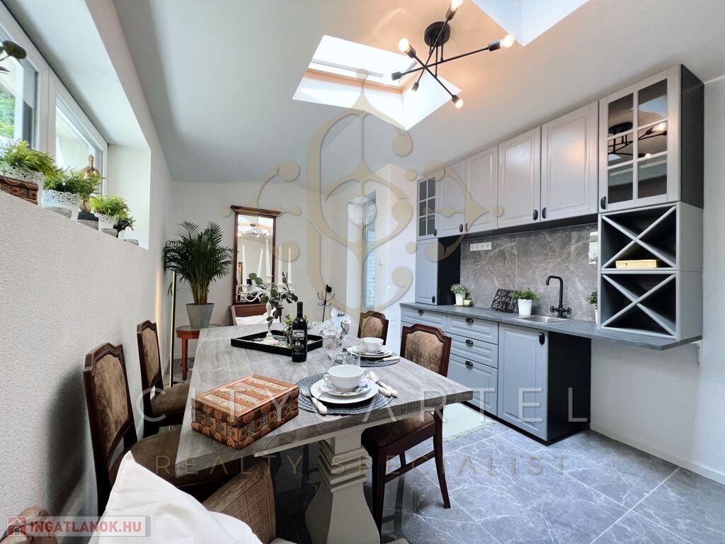 Az emeleten található egy kétszintes, étkező-konyha + 6 szobás (alsó szinten panorámás nappali nagy ablakokkal, 3,5 m belmagassággal, 2 szoba, fürdőszoba, vendégfürdő, mosókonyha – felső szinten 3 szoba, 2 fürdőszoba) vintage hangulatú lakosztály, amelynek legfelső emelete akár még tovább szeparálható. A tetőtér vörösfenyő gerendázatú, 25 cm paplan szigeteléssel biztosítja a kellemes klímát.