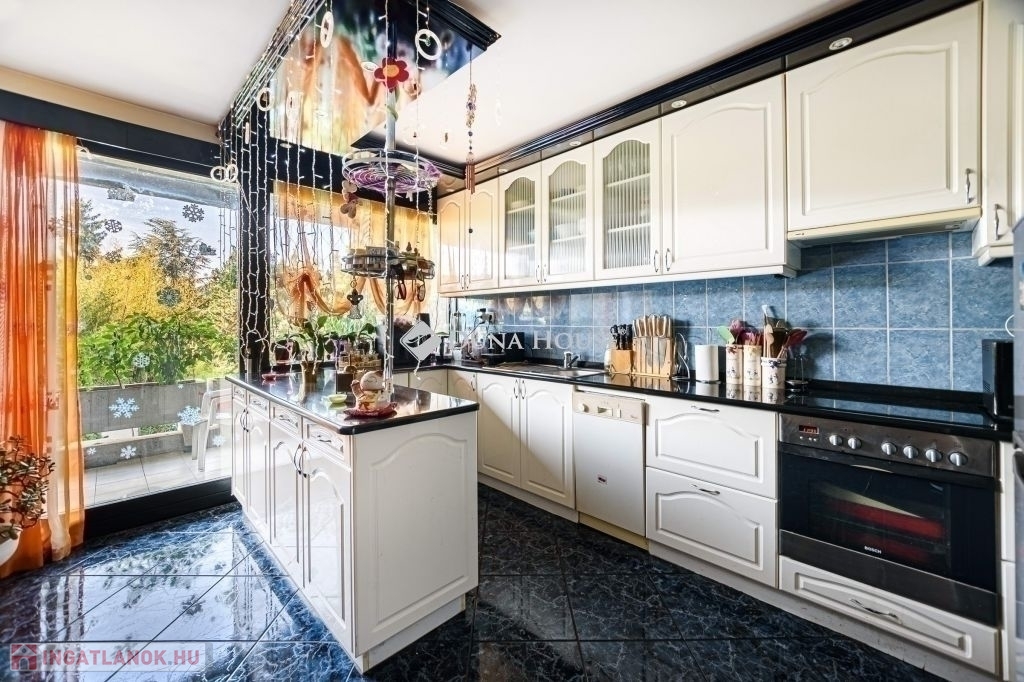 Elosztása: nappali + konyha + étkező és 3 szoba (melyek közül kettő jelenleg egybe van nyitva), 2 fürdő (kádas és zuhanyzós) + 3 wc, konyhából nyíló kamra, 4 db 10m2-es terasz tartozik hozzá, melyekről csodás PANORÁMA tárul elénk.