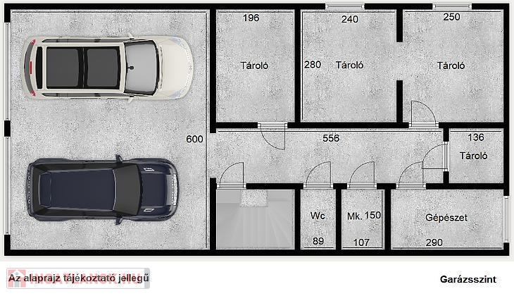 A garázsszinten helyet kapott egy két garázsajtóval rendelkező dupla garázs (30nm), 3 kényelmes méretű tároló, 2 vizes helység, egy wc és egy gépészeti helység. A terek jól variálhatók, akár sport vagy hobbiszoba is kialakítható. A garázs közvetlen lépcsőházi kapcsolattal rendelkezik a földszinti szinttel.