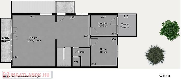 A földszinten találunk egy központi étkezőt, egy tágas, utcai irányba tekintő, erkélykapcsolatos nappalit, egy hátsó kertre néző szobát, egy kertkapcsolatos konyhát, és egy zuhanyzóval és szeparált wc-vel rendelkező fürdőszobát.