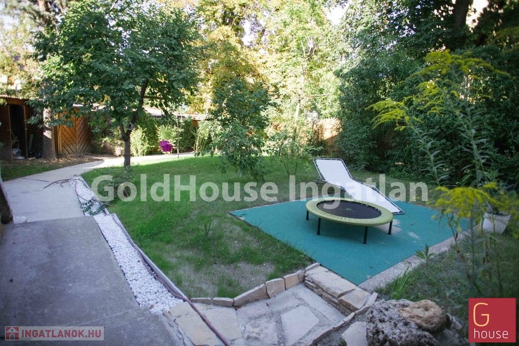 A kertben két garázs, gépkocsi beálló van, ahol több autó is parkolni tud, illetve gyümölcsfák, és négy darab tároló is található.