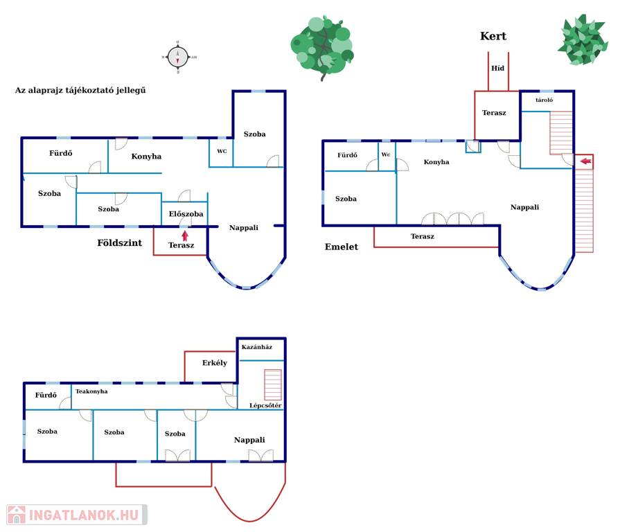 Az ingatlan három hrsz-en van, tehát akár lakásonként is bérbeadható v. eladható.