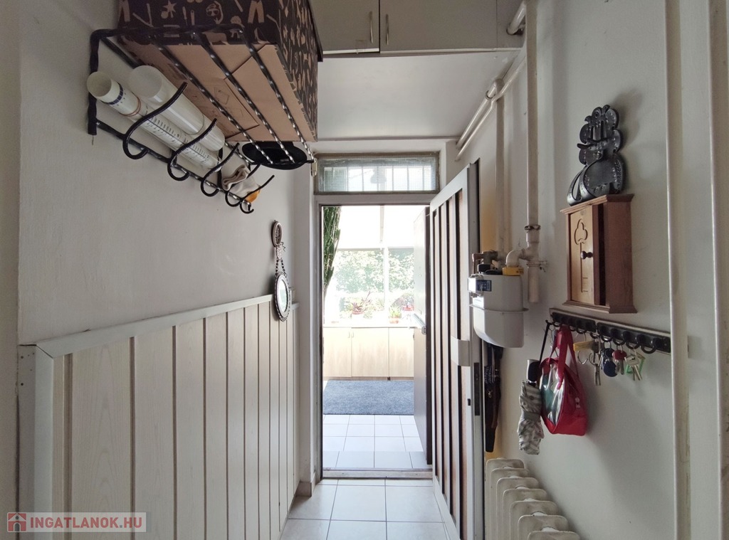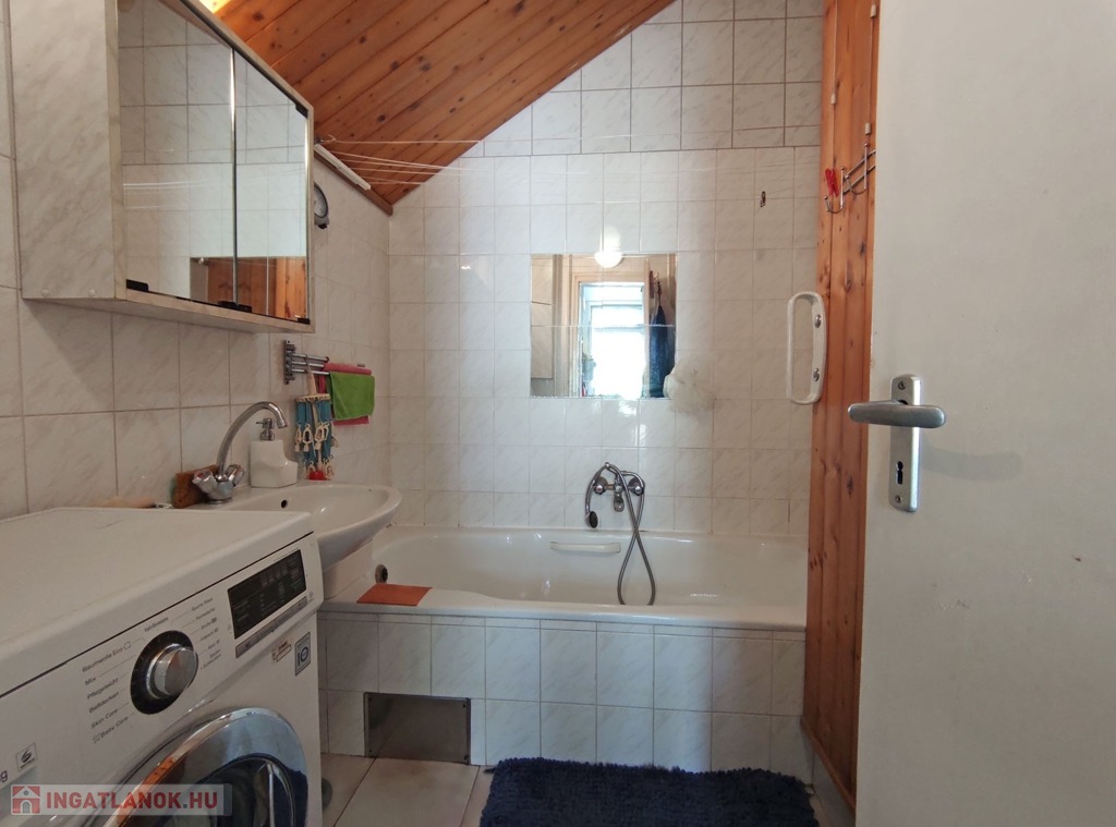 Az udvarba a fém biztonságos bejárati kapun keresztül jutunk. Belépve a virágokkal beültetett kerten át érkezünk a klímával felszerelt télikertbe, ahol kellemes a pihenés. Az alsó szinten, jobbra a fa parkettával burkolt szoba, mellette a kádas fürdőszoba, amiben egy westen kondenzációs kazán szolgáltatja a fűtést, külön helységben a toalett. Balra tovább a gépesített, bútorozott konyha ennek az ablaka a téli kertre néz, szemben a másik szoba és az emeletre vezető fa lépcső található. A felső szinten balra nyílik egy szoba, szemben a kádas fürdőszoba, jobbra halva egy kényelmes ablakos hall, mellette a félszoba nyújt kényelmes életteret a család minden tagjának. A lépcső fölött beépített könyves polc, mellette a szoba bejáratánál mindkét oldalon, beépített tárolók vannak. Ez a ház kiváló több gyerekes családoknak, de akár befektetőknek is vállalkozás elindításához kitűnő lehetőség. A használati megosztás folyamatban van.