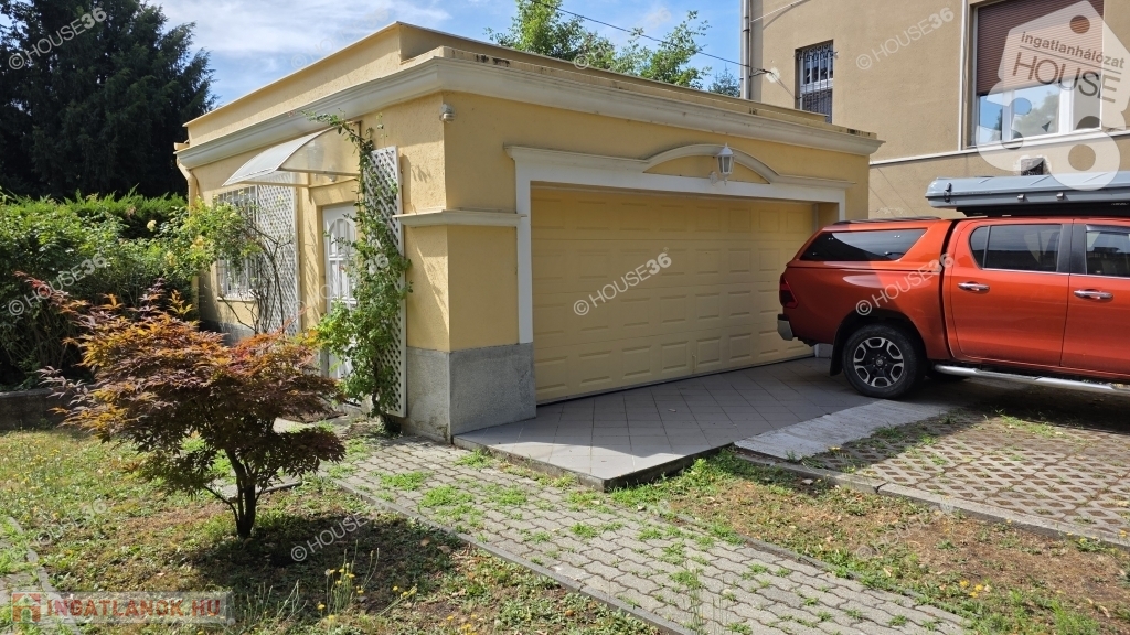 Az teljesen önálló saroktelekre két utcáról is nyílik bejárat.Autóval távirányítású kertkapun keresztül lehet behajtani a Korong utca felől a 36 m2-es dupla garázsba, amelyben külön leválasztott mosdó is található.