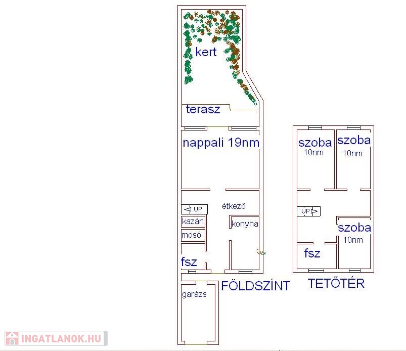 Földszínt: Kertkapcsolatos nappali, előszoba, étkező, konyha, fürdőszoba, mosókonyha, kazánház, közlekedő.