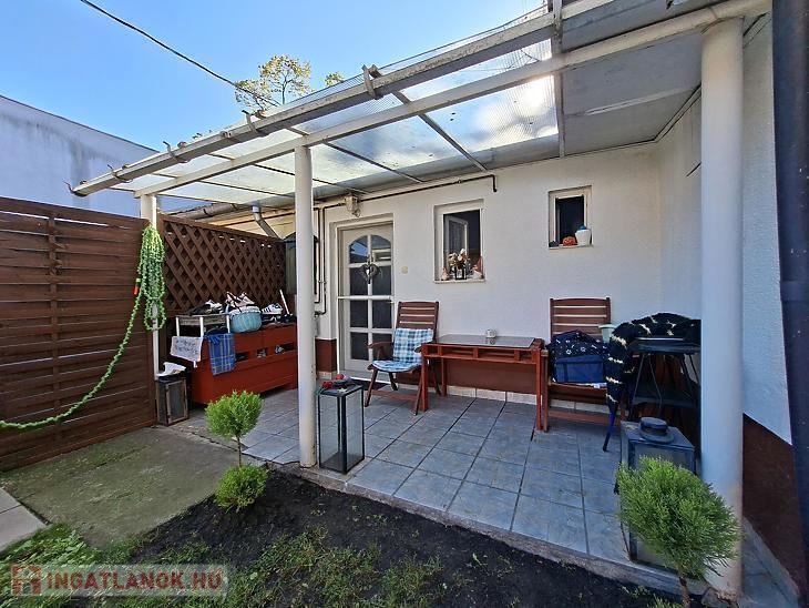 A lakás külön bejárattal rendelkezik, saját, fedett 6 m²-es teraszról közelíthető meg, mely egy teljesen privát, 100 m²-es kertrészhez kapcsolódik – ideális lehet pihenéshez, kertészkedéshez vagy akár kisállattartáshoz is.