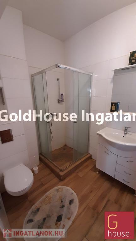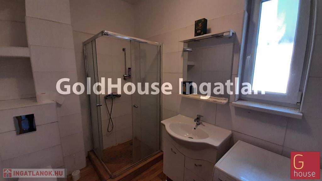 A főépület elosztása: 27 nm-es előszoba-amerikai konyhás nappali, melynek két oldalán is vannak kertre néző ablakok, így világos. A mellette lévő utcai ablakos helyiségből nyílik a fürdőszoba-WC és a szintén utcára néző hálószoba. A fürdőszoba zuhanyzós, kellemesen tágas, ablaka kertre nyíló, a meleg vizet villany bojler adja.