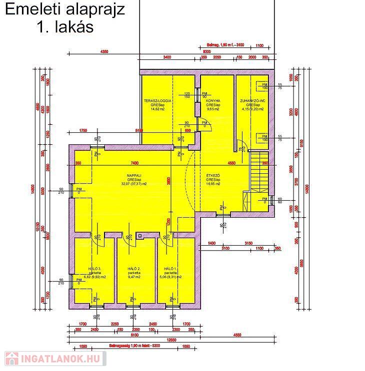A földszinten előtér, szoba, mellékhelyiség és egy 15 m2-es erkély található. Az emeleten tágas amerikai konyhás nappali, 3 szoba, egy nagyobb fürdőszoba (kád és zuhanyzó is van benne) és egy 15 m2-es erkély került kialakításra.