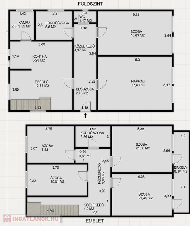 A földszinti részen, konyha, nappali, étkező, szoba, kamra, közlekedő, fürdőszoba, mellékhelyiség és terasz található. Az emeleten 4 szoba, hall, fürdőszoba és erkély került kialakításra.