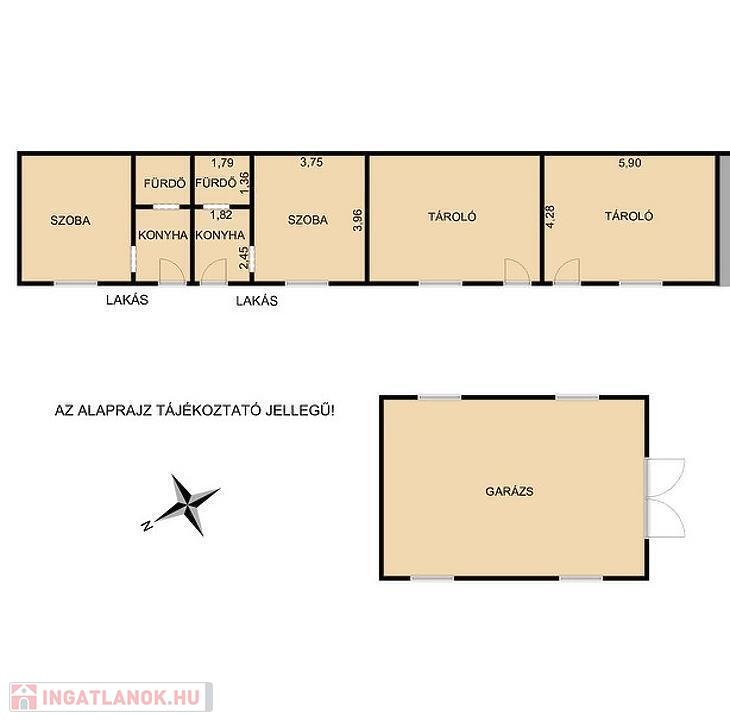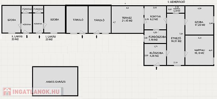 A könnyűszerkezetes melléképületben már ki van alakítva 2 db 22 m2-es lakás, ami egy szoba-konyha-fürdőből áll, valamint 2 db 25 m2-es jelenleg tárolóként használt egység, ami szintén átalakítható lakótérré.