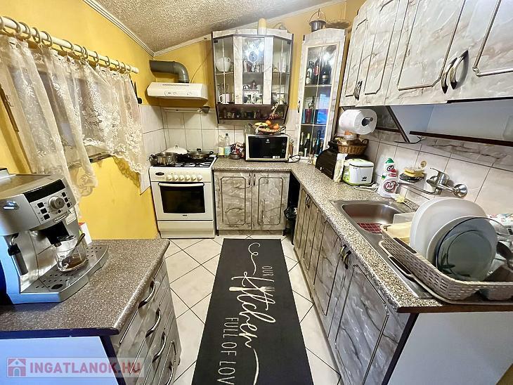 A 80 m2-es első generációs egységben 6 éve műanyagra cserélték a nyílászárókat, leszigetelték, újra parkettáztak, valamint a villanyhálózat részleges cseréje is megtörtént. A fűtést elektromos panelek és fa tüzeléses kandalló biztosítja, a melegvizet 120 literes villanybojler. A hálószobában az idei évben további 4 évre szóló garanciával rendelkező hűtő-fűtő klíma lett beszerelve. A ház előszobából, konyhából, étkezőből, kamrából, ülőkádas fürdőből és 2 szobából áll és egy 22 m2 fedett terasz tartozik hozzá.