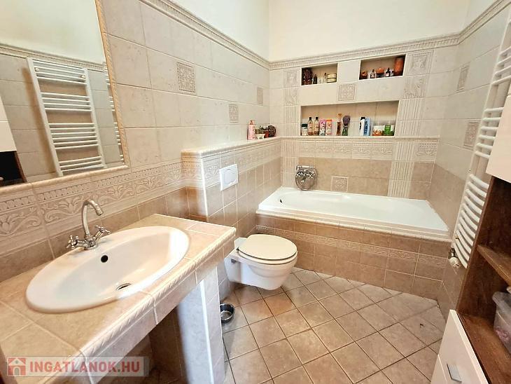 Tágas nappali, 3 szoba (egyik szoba jelenleg étkezőként funkcionál, konyha, 2 fürdőszoba, előszoba és közlekedő áll rendelkezésre. A teljes víz-, villanyhálózat 2010-ben lett felújítva, ekkor történt meg a fűtésrendszer korszerűsítése is. A fűtésről kondenzációs kazán és lapradiátorok gondoskodnak és egy hűtő-fűtő klíma is rendelkezésre áll. A nyílászárók műanyagok, hőszigeteltek, minden ablak szúnyoghálóval van ellátva. A burkolatok szép állapotban vannak. A konyhabútor a vételár részét képezi, a többi berendezés megegyezés tárgya. A nappaliból is megközelíthető a 20 m2-es terasz.
