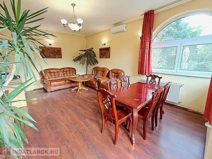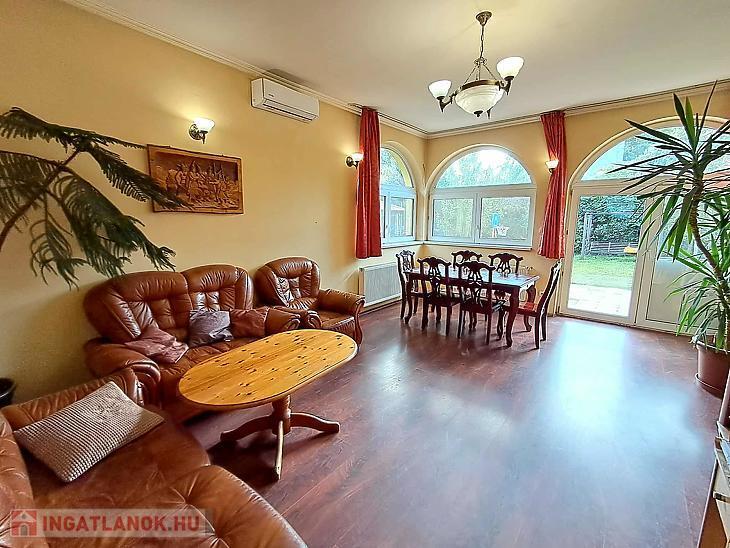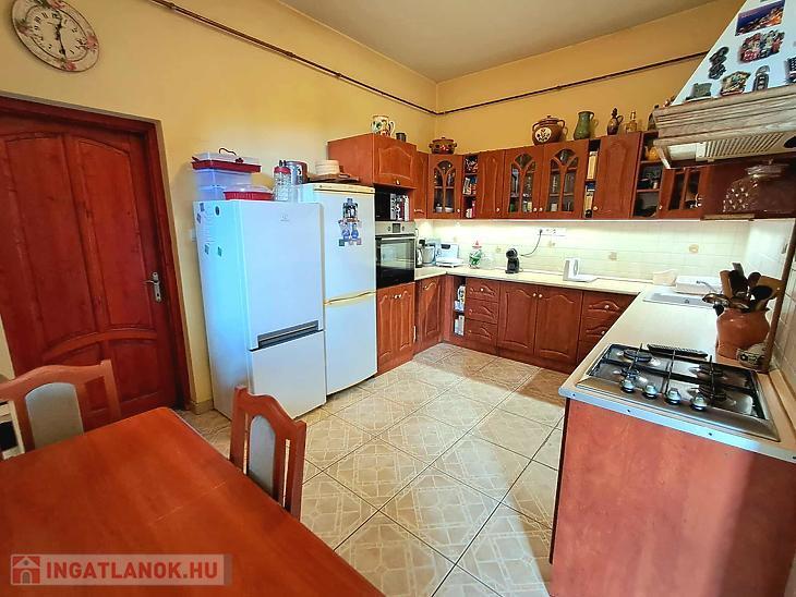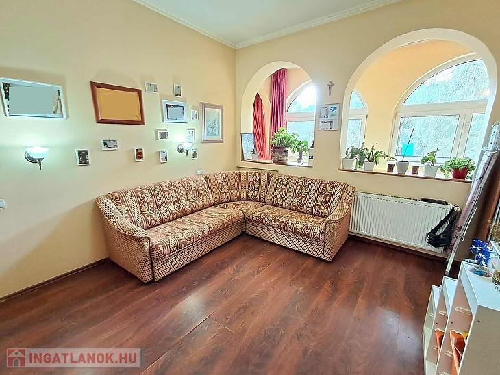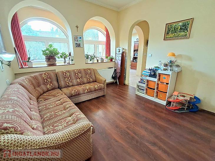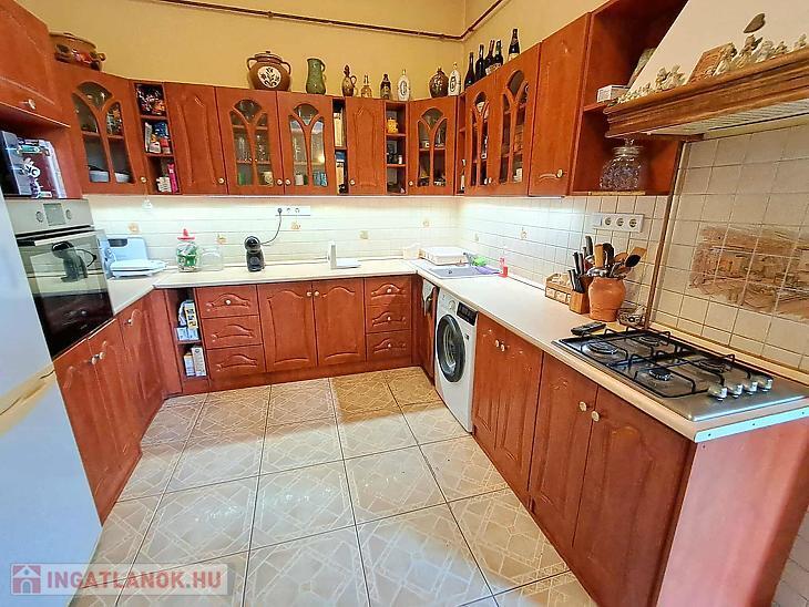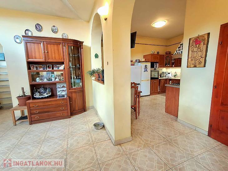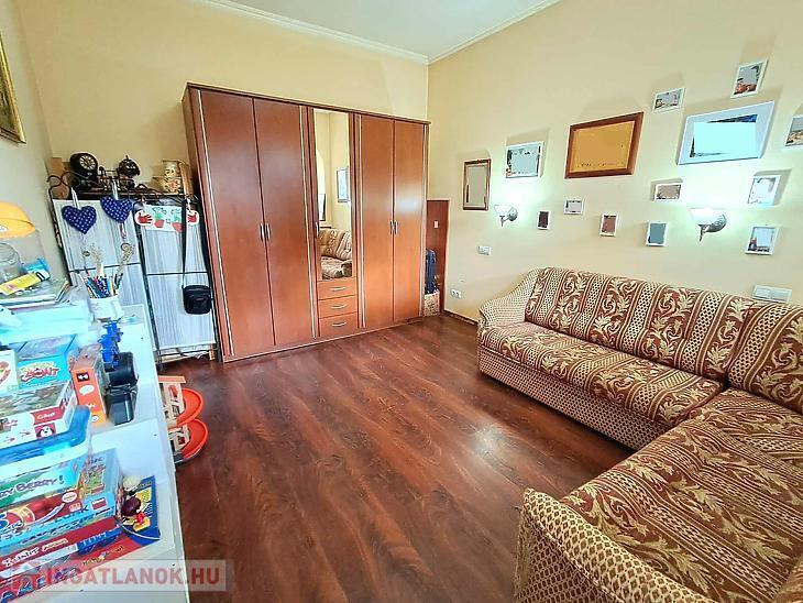 Tágas nappali, 3 szoba (egyik szoba jelenleg étkezőként funkcionál, konyha, 2 fürdőszoba, előszoba és közlekedő áll rendelkezésre. A teljes víz-, villanyhálózat 2010-ben lett felújítva, ekkor történt meg a fűtésrendszer korszerűsítése is. A fűtésről kondenzációs kazán és lapradiátorok gondoskodnak és egy hűtő-fűtő klíma is rendelkezésre áll. A nyílászárók műanyagok, hőszigeteltek, minden ablak szúnyoghálóval van ellátva. A burkolatok szép állapotban vannak. A konyhabútor a vételár részét képezi, a többi berendezés megegyezés tárgya. A nappaliból is megközelíthető a 20 m2-es terasz.