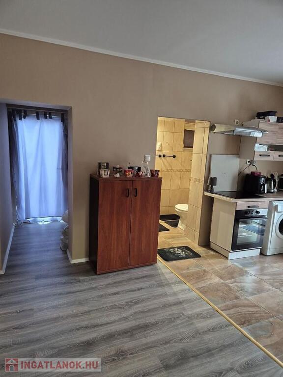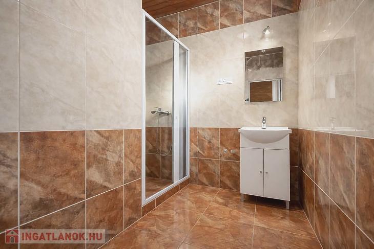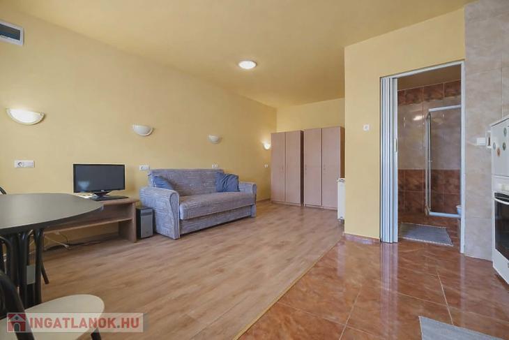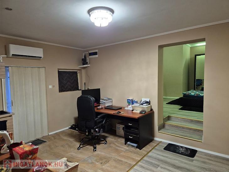 A 45 m2-részben amerikai konyhás nappali, hálószoba, fürdőszoba található, illetve terasz. Kívülről szigetelt, a villanyhálózat cserélve lett. A nyílászárók műanyagok, hőszigeteltek. A hűtés-fűtés 2 db. klímával megoldott („H” tarifa kialakítva).