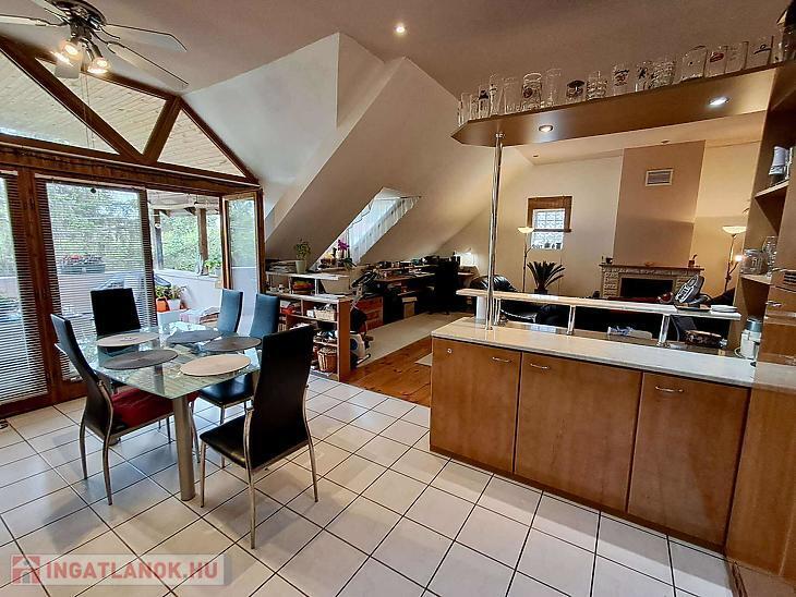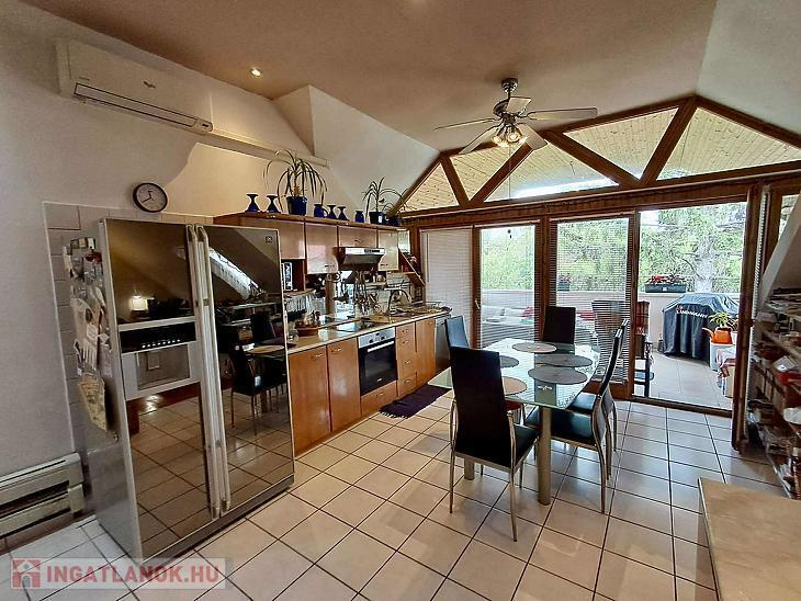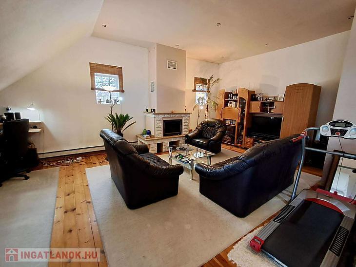 Téglaégetésű, az 1990-es években épült, esztétikai és műszaki felújítást igényel. Összesen 6 szoba, 2 konyha, 2 fürdőszoba, tároló, pince áll rendelkezésre. A fűtést kombi cirkó és 4 db hűtő-fűtő klíma biztosítja. Tartozik az ingatlanhoz egy 20 m2 terasz és egy 12 m2-es erkély. Az alsó és a felső szinten a mérőórák külön vannak.