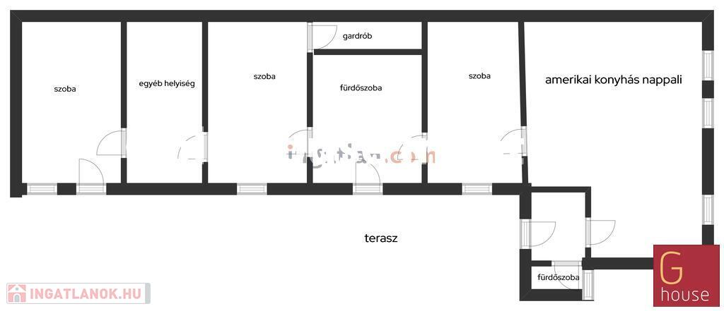 Elosztása: előszoba, zuhanyzós fürdőszoba+wc, amerikai konyhás nappali, 2 hálószoba, melyből az egyik gardróbszobával is rendelkezik. A fő fürdőszoba szinte wellness részleg: masszázs zuhany és masszázs kád és persze toalett is van bent. Különlegessége, hogy közvetlen ajtó nyílik a teraszra is, így a kerti munkák vagy napozás után nem szükséges körbejárni a házat, egyből megközelíthető a fürdő. A melléképület részen kazánház-mosókonyha és egy világos szoba helyezkedik el, mely sokrétűen hasznosítható pl. irodának, vendégszobának vagy vállalkozás esetén elszeparált a munkaterület.