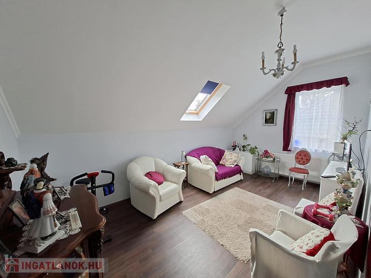 A körbejárható épületen 2022-ben teljeskörű felújítást végeztek. A földszinten egy amerikai konyhás nappali, kamra, hálószoba, fürdőszoba és előszoba található, az emeleten egy fürdő és 3 hálószoba lett kialakítva, amiből az egyik jelenleg gardróbként funkcionál. A fűtést kondenzációs kazán és a lenti szinten padlófűtés, illetve egy hűtő-fűtő klíma biztosítja. 3 rétegű, műanyag ablakok vannak beépítve, a ház 10 centiméteres grafit szigetelést kapott, így a leghidegebb téli hónapban sem több a gázszámla 20 ezer forintnál.